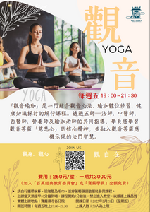 本課程由法師講授觀音法門,邀請中醫師、營養師及醫師分享健康養生與飲食調理之道,再由專業瑜珈老師帶領,透過瑜珈體位法與呼吸覺察,舒展經絡,喚醒內在力量。